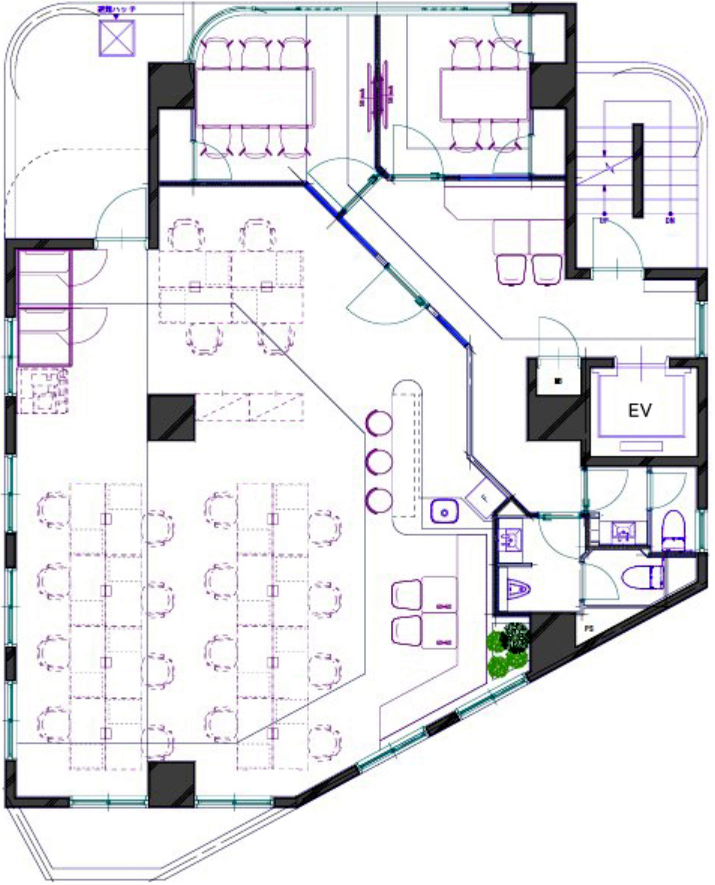 このエリアの敷金なし、原状回復なしのセットアップオフィス個室会議室×2と個室ブースが設置済み。執務室は20名前後でのご利用を想定。