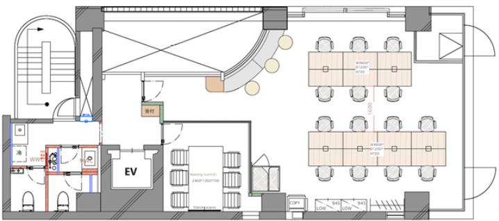 このエリアのセットアップオフィス、16名分の什器・受付・6名用会議室・4名用ファミレスブース・テレカンブース・ラウンジスペース・