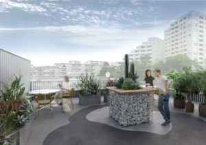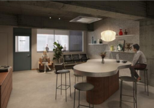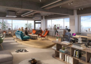 このエリアのシェアオフィス、ラウンジ、ルーフトップ、会議室、フォンブースが設置済み。