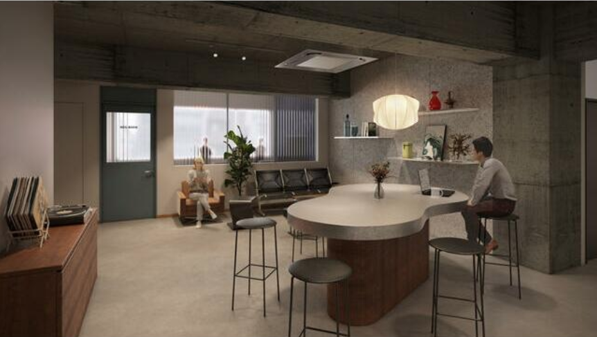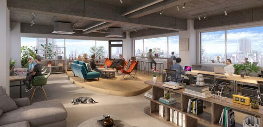 このエリアのシェアオフィス、ラウンジ、ルーフトップ、会議室、フォンブースが設置済み。