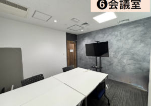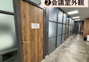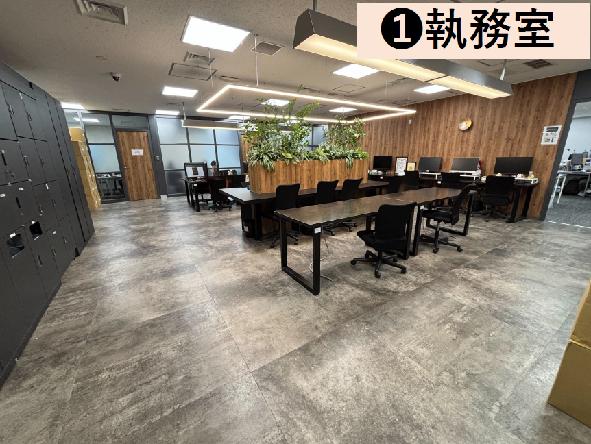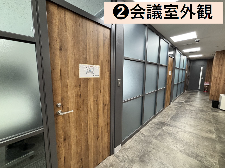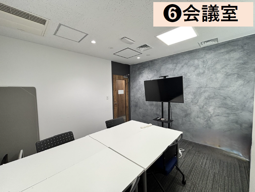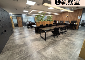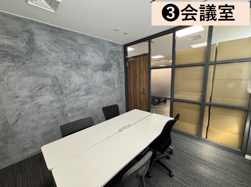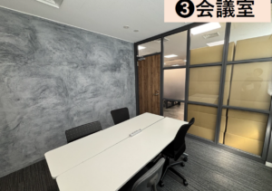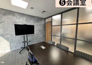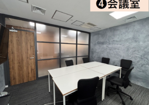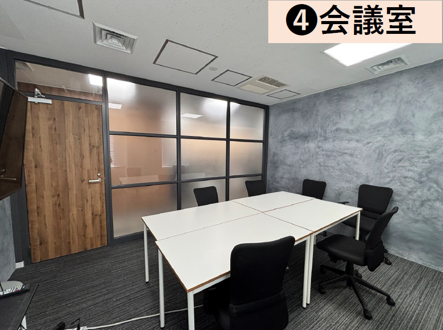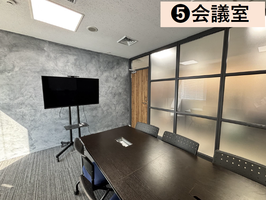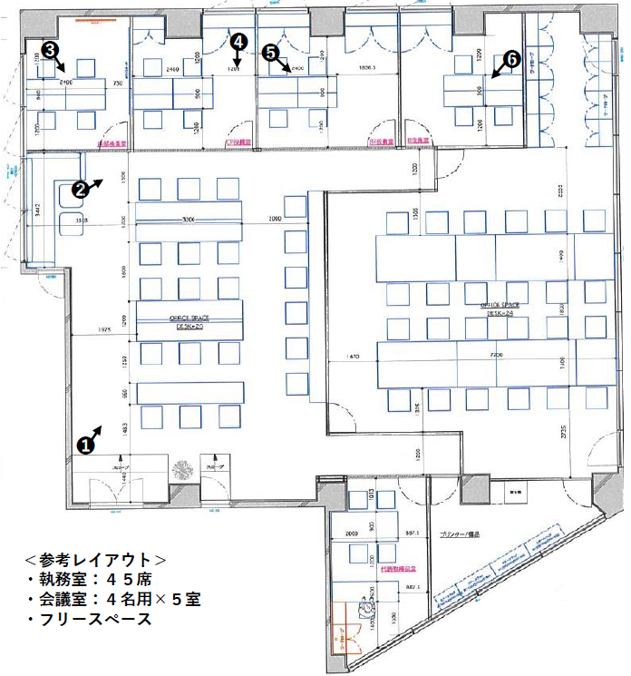 このエリアの居抜きオフィス、4名用×5の個室会議室が設置済み。執務室は45名前後でのご利用を想定。