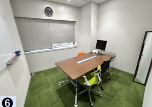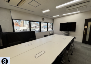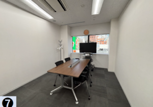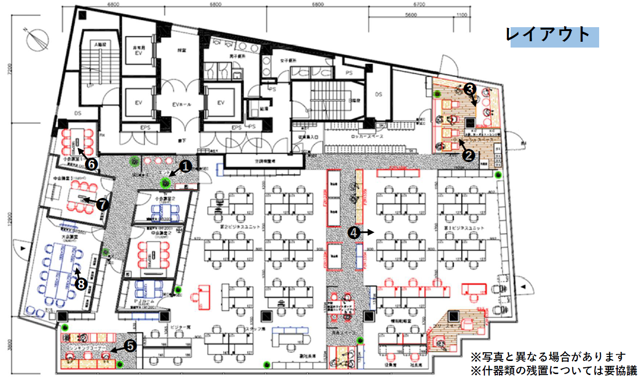 このエリアの大型居抜きオフィス、4名用×2・6名用×3・10名用の個室会議室が設置済み。執務室は60名前後でのご利用を想定。