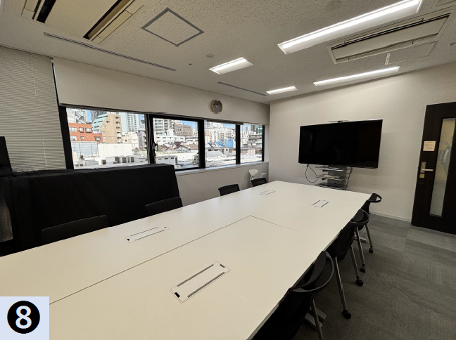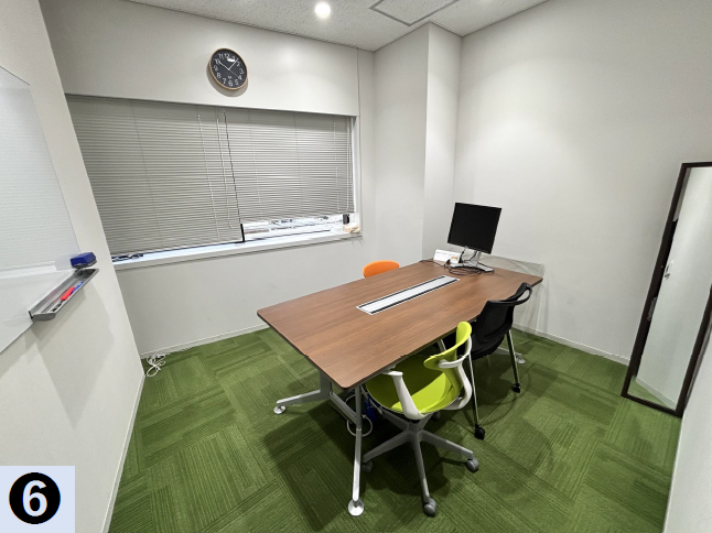 このエリアの大型居抜きオフィス、4名用×2・6名用×3・10名用の個室会議室が設置済み。執務室は60名前後でのご利用を想定。