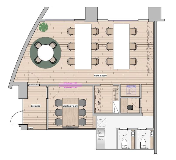 このエリアのフルセットアップオフィス、受付、6名会議室、ミーティングスペース完備。