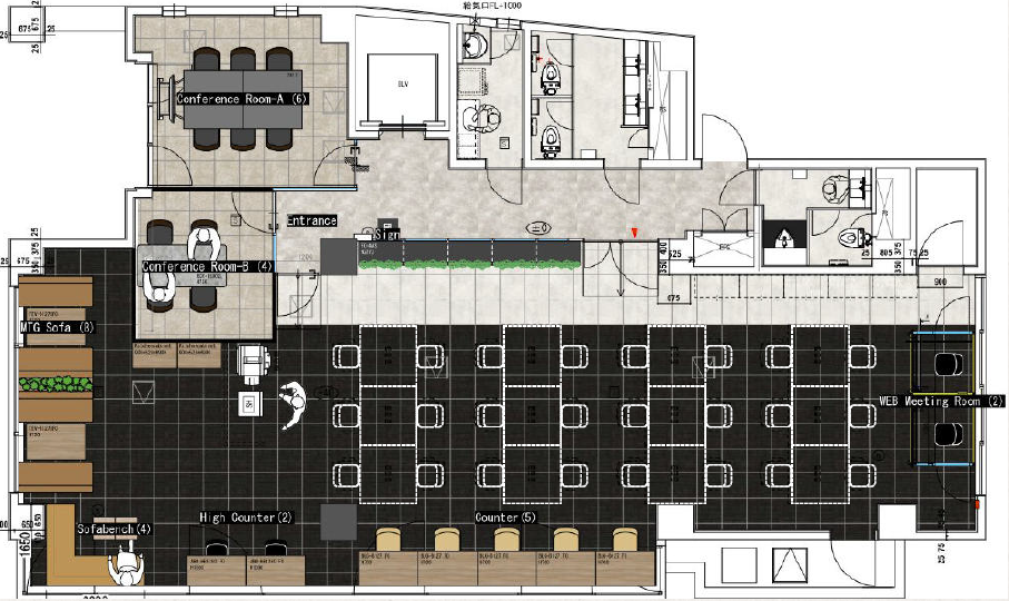 4名用・6名用の個室会議室と個室ブースが設置済み。