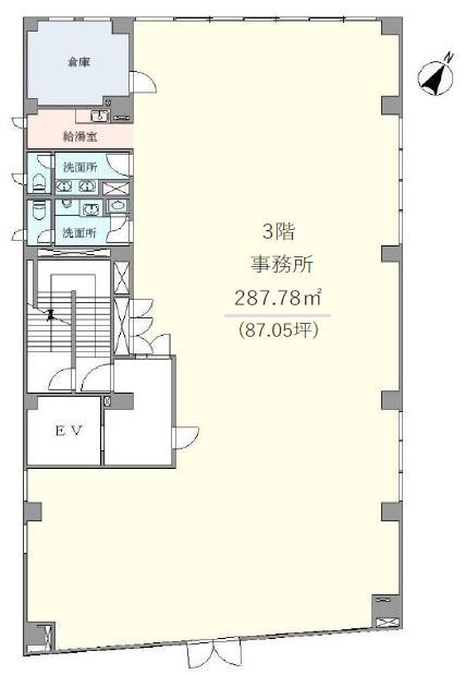 鉄筋コンクリート造地上3階、地下1階の1フロア1テナントの賃貸オフィス、基準階面積87.05坪、エレベーター1基、