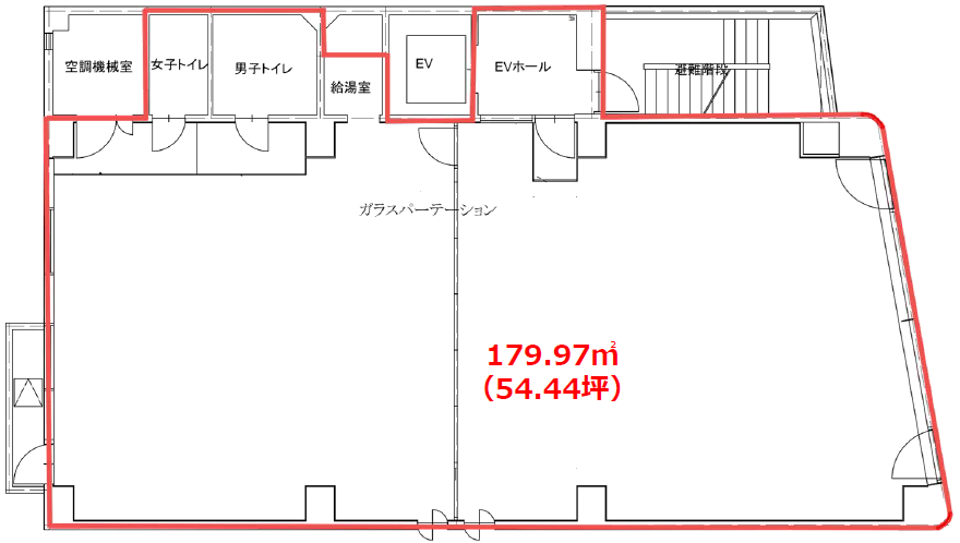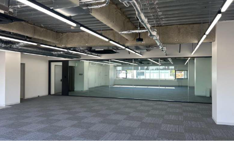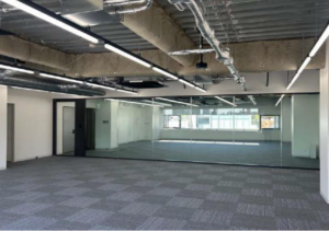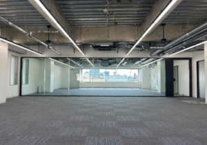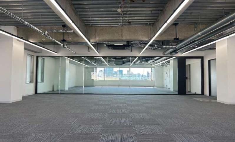 このエリアのガラスパーテーション付きオフィス、スケルトン天井の開放的な空間の賃貸オフィスです。