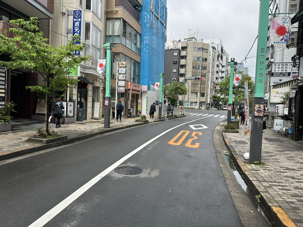 周辺は恵比寿西の商店街沿いで、飲食店・カフェ・ショップが多く、人通りの多い賑やかな環境。