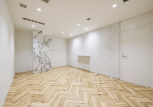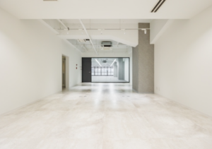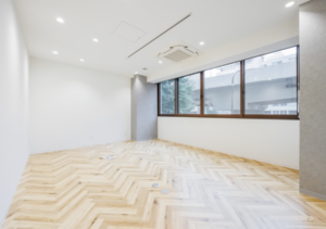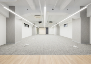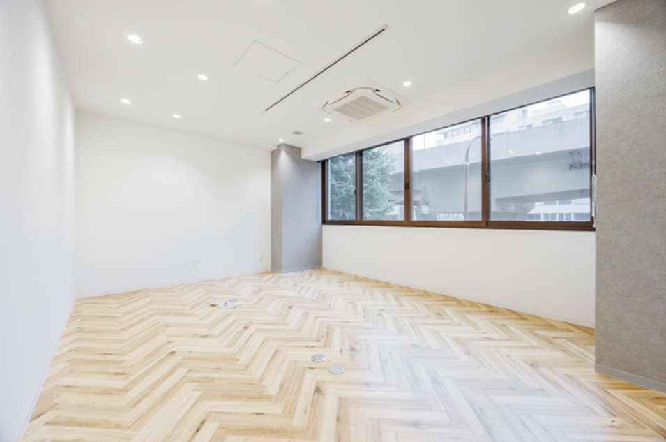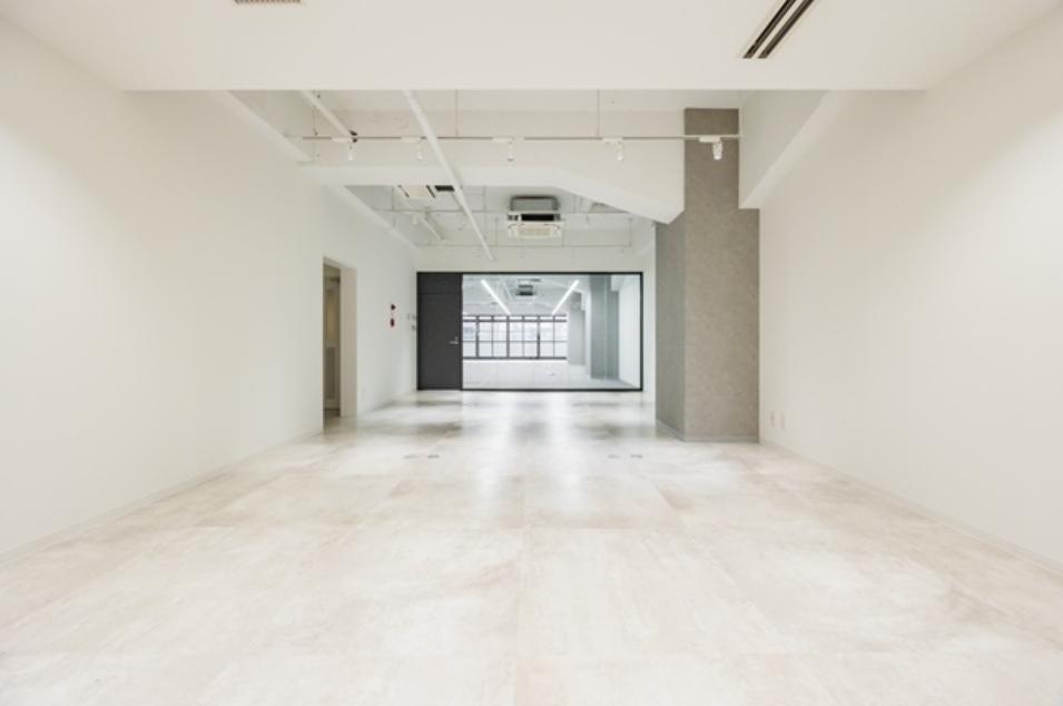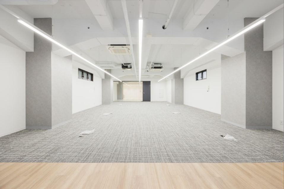 このエリアのリノベオフィス。専用のラウンジや屋上の休憩スペースなどの施設もあり、室内には会議スペースも設置済み、
