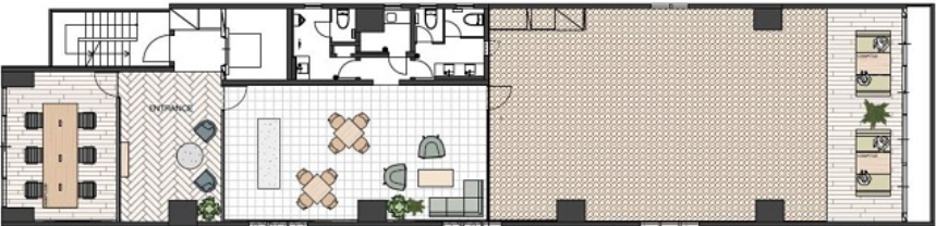 このエリアのリノベオフィス。専用のラウンジや屋上の休憩スペースなどの施設もあり、室内には6名用の会議スペースも設置済み、