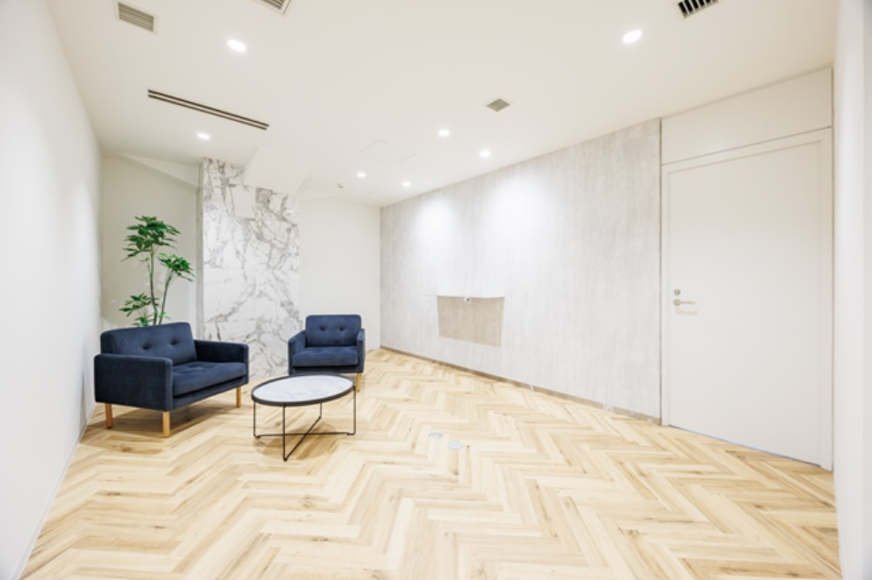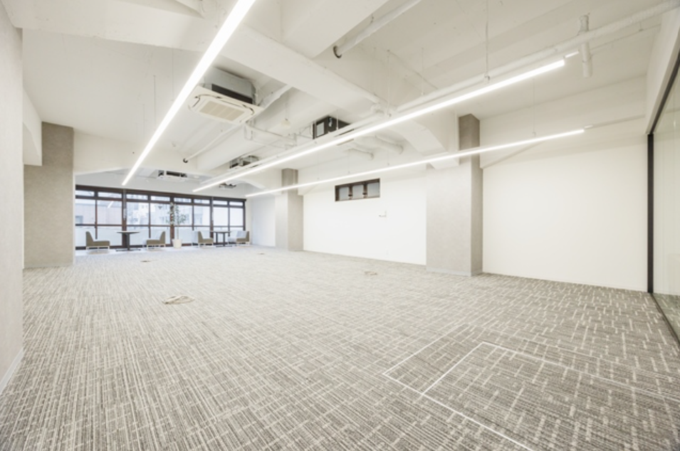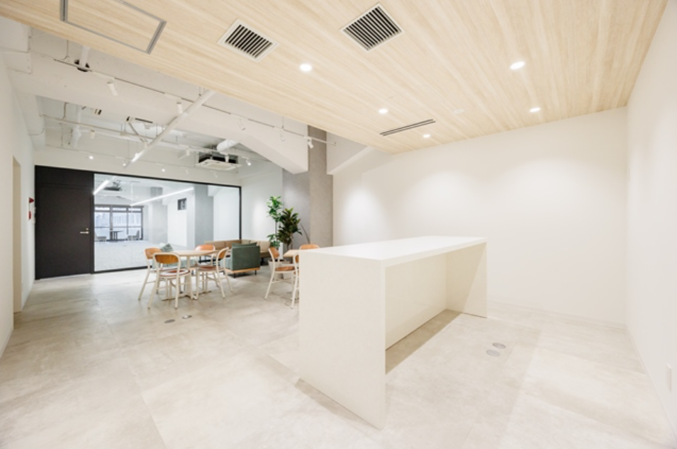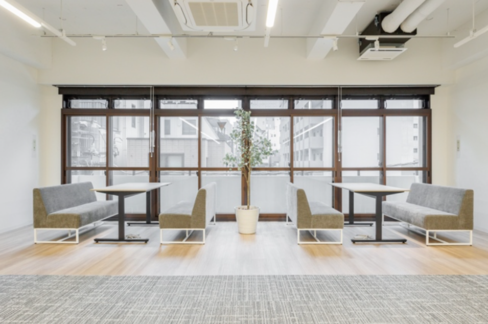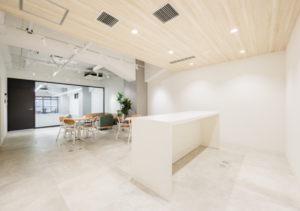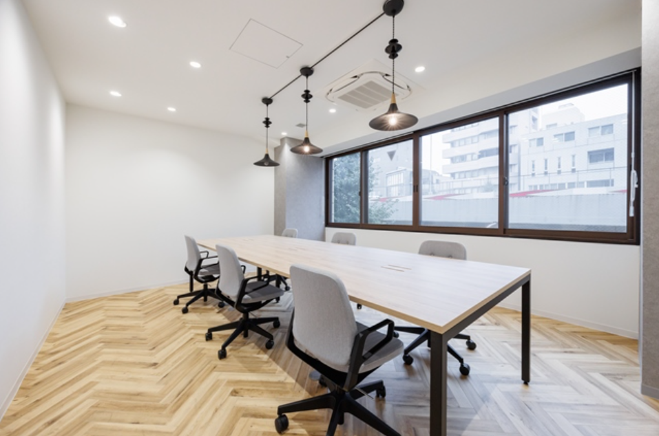 このエリアのリノベオフィス。専用のラウンジや屋上の休憩スペースなどの施設もあり、室内には6名用の会議スペースも設置済み、