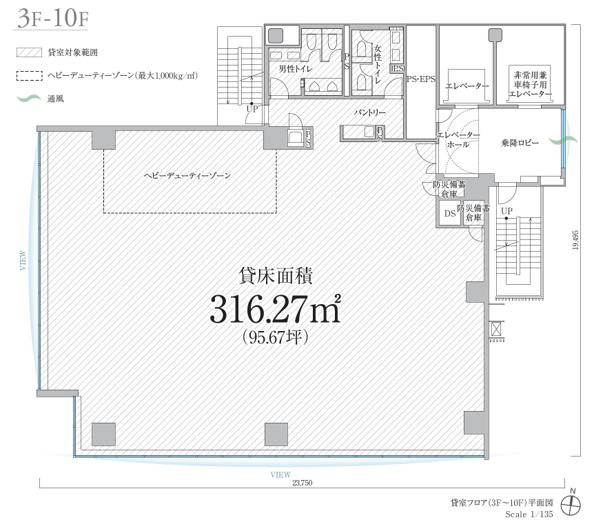 天井高2,800 mm、 個別空調、男女別トイレ、機械警備あり。
