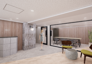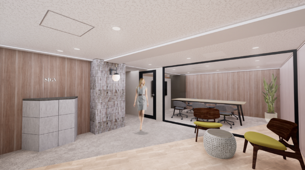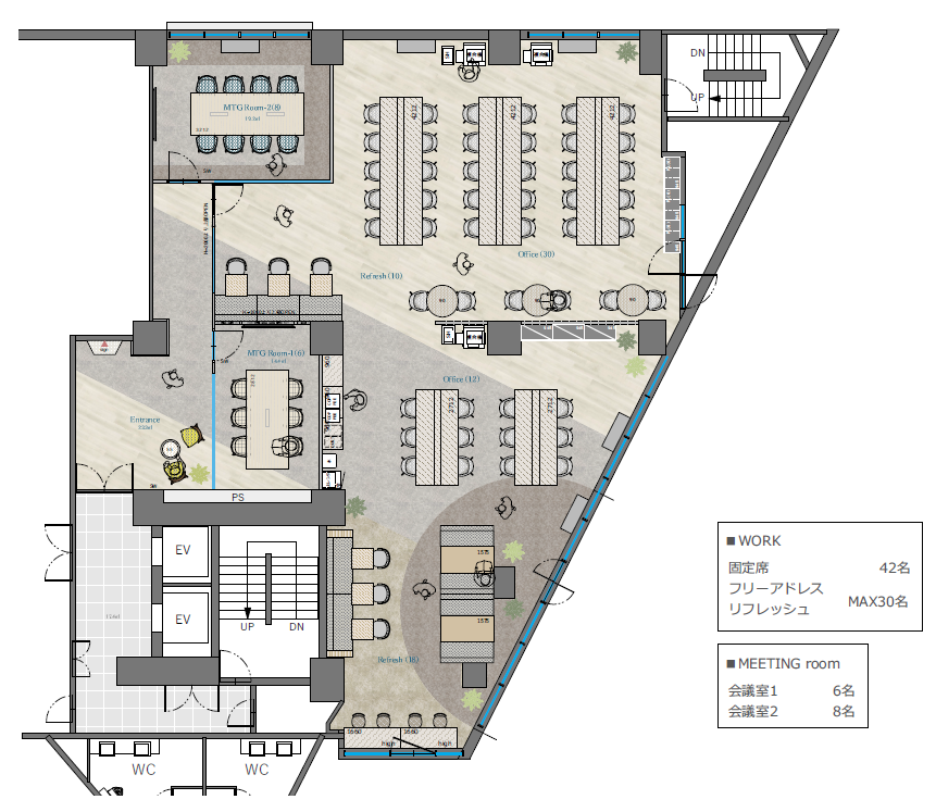 このエリアのセットアップオフィス、6名用・8名用の個室会議室が設置済み。