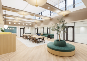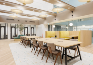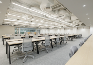 このエリアのセットアップオフィス、4名用×2・6名用・10名用の個室会議室とラウンジ、テレカンブースが設置済み。執務室は最大70名前後でのご利用を想定。