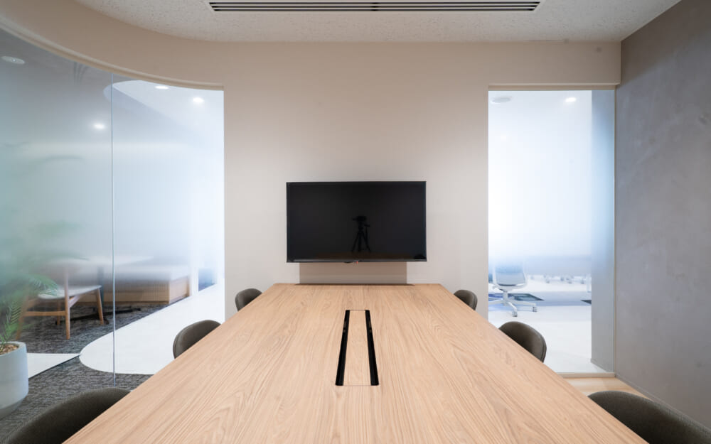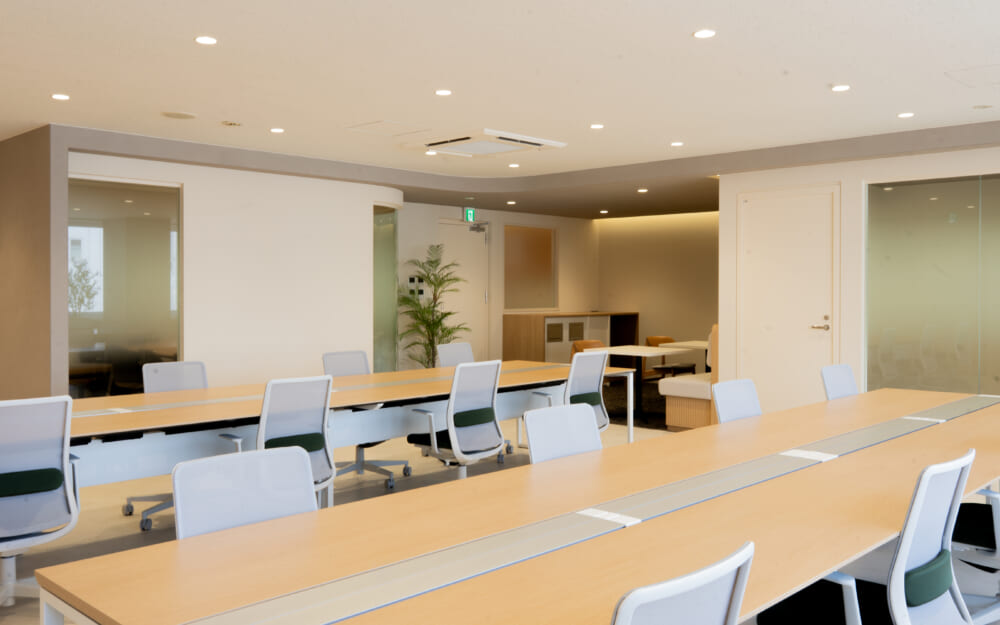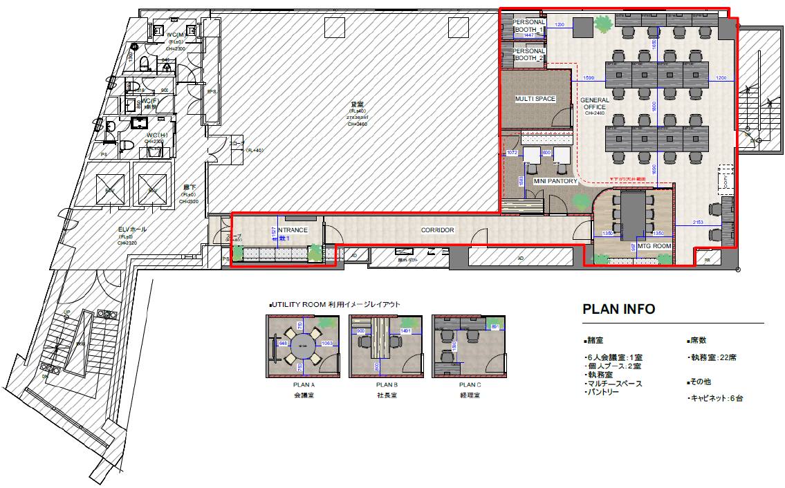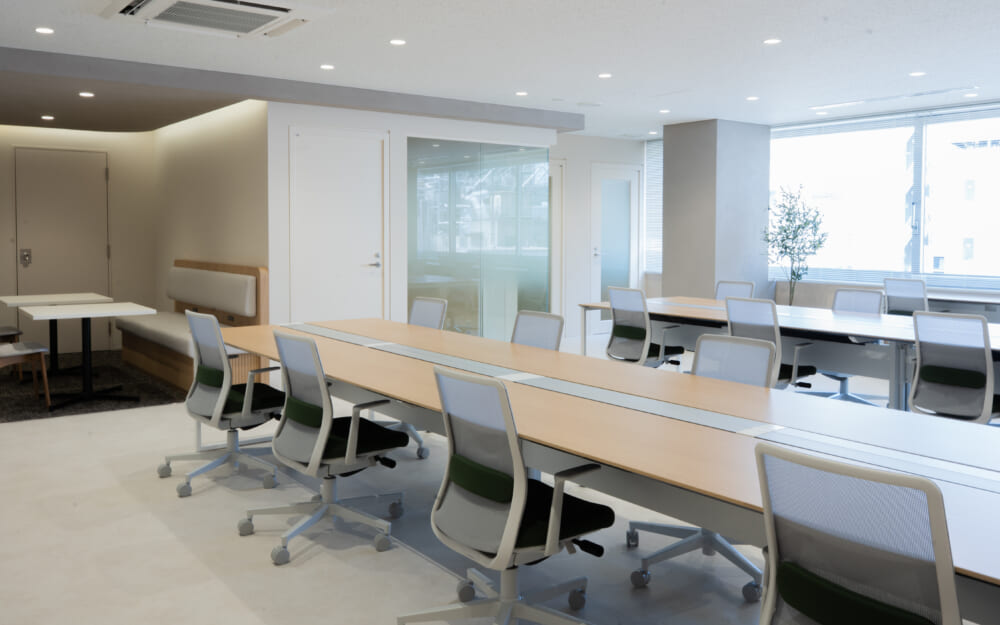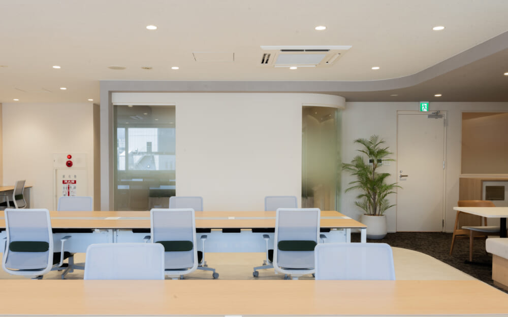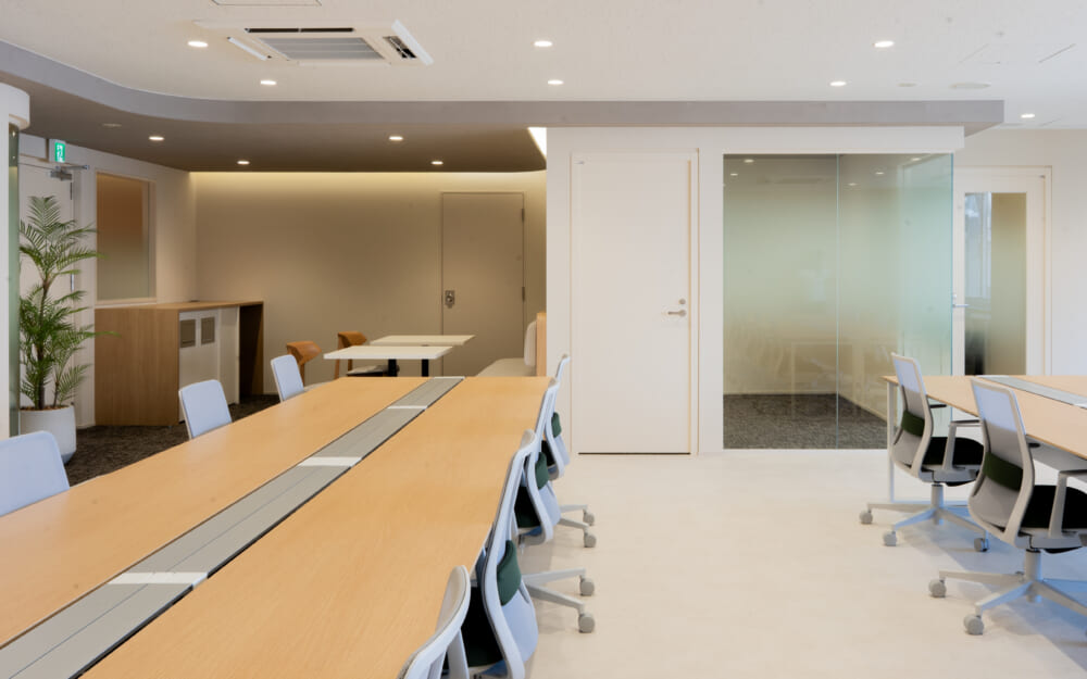 このエリアのセットアップオフィス、6名用の個室会議室と個室ブースが2ヵ所設置済み。執務室は22名でのご利用を想定。