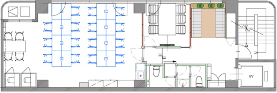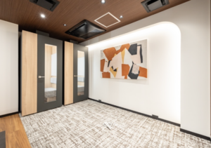 このエリアのフルセットアップオフィス、6名用の個室会議室とオープンmtgスペース、個室ブース2ヵ所が設置済み。執務室は15名前後でのご利用を想定。