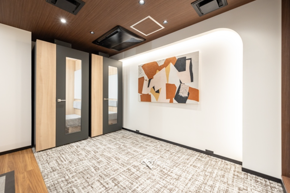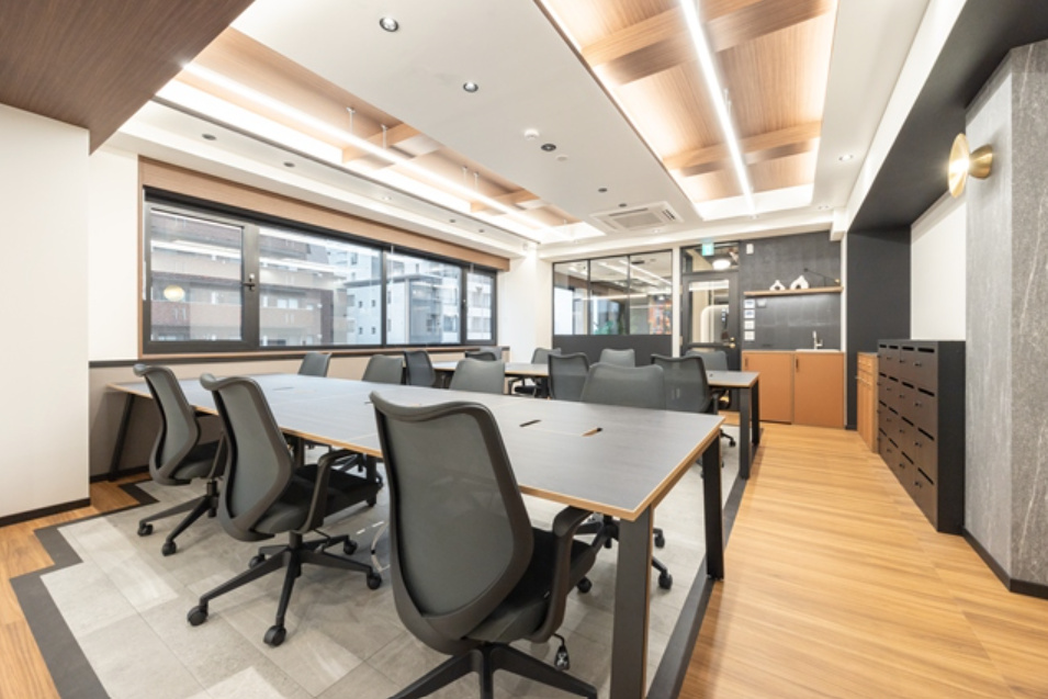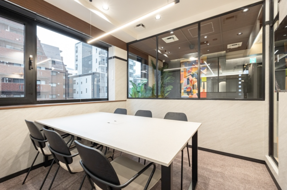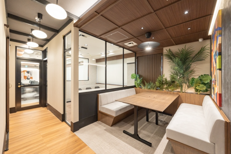 このエリアのフルセットアップオフィス、6名用の個室会議室とオープンmtgスペース、個室ブース2ヵ所が設置済み。執務室は15名前後でのご利用を想定。