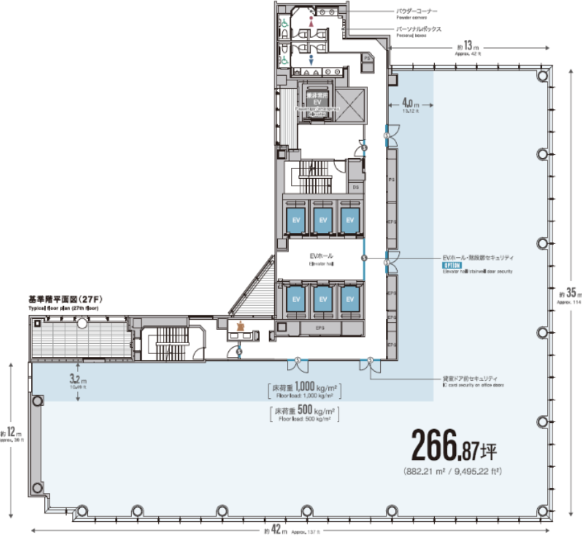 天井高2.8m、OAフロア10cm、床荷重500kg/㎡(一部1,000kg/㎡)。駐車場・機械式・平面式併設。