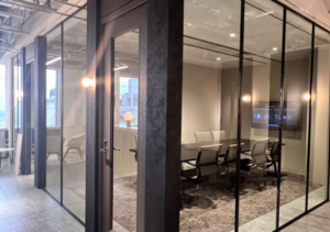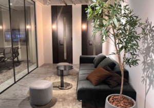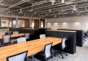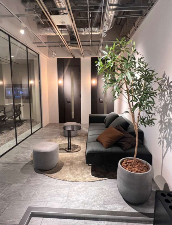 このエリアの内装付きオフィス、8名用×2の個室会議室とラウンジスペース、フォンブースが設置済み。