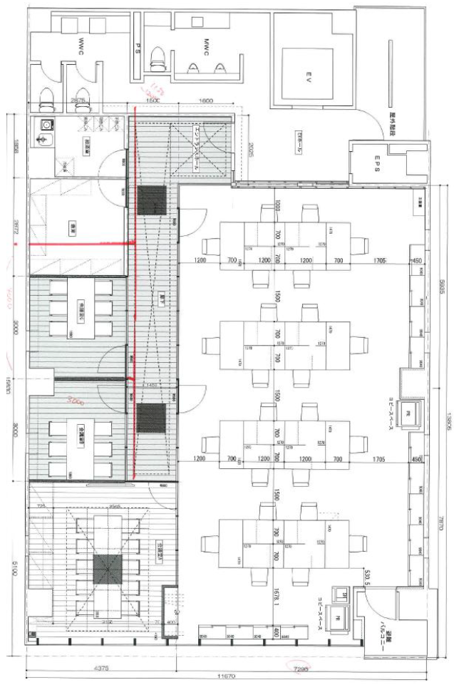 このエリアの居抜きオフィス、6名用×2・10名用の個室会議室が設置済み。執務室は25名前後でのご利用を想定。