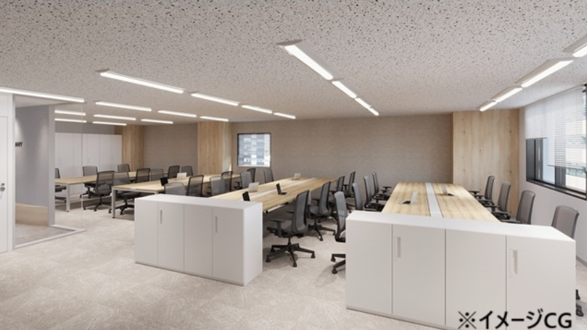 このエリアのセットアップオフィス、8名用の個室会議室が設置済み。執務室は最大28名でのご利用を想定。
